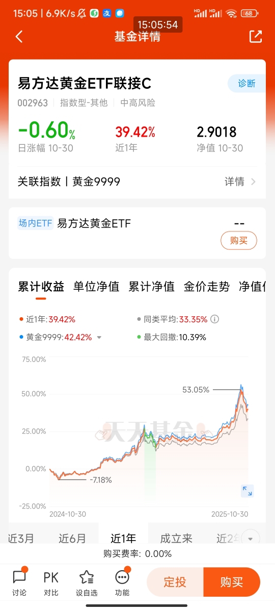选择等待不代表无所作为。相反,我正在利用这段时间深入研究市场动态,完善自己的投资策略。易方达黄金ETF联接C(002963)作为便捷投资黄金的工具,其近一年最大回撤为-10.39%,优于多数同类基金,是我未来考虑配置的对象。
