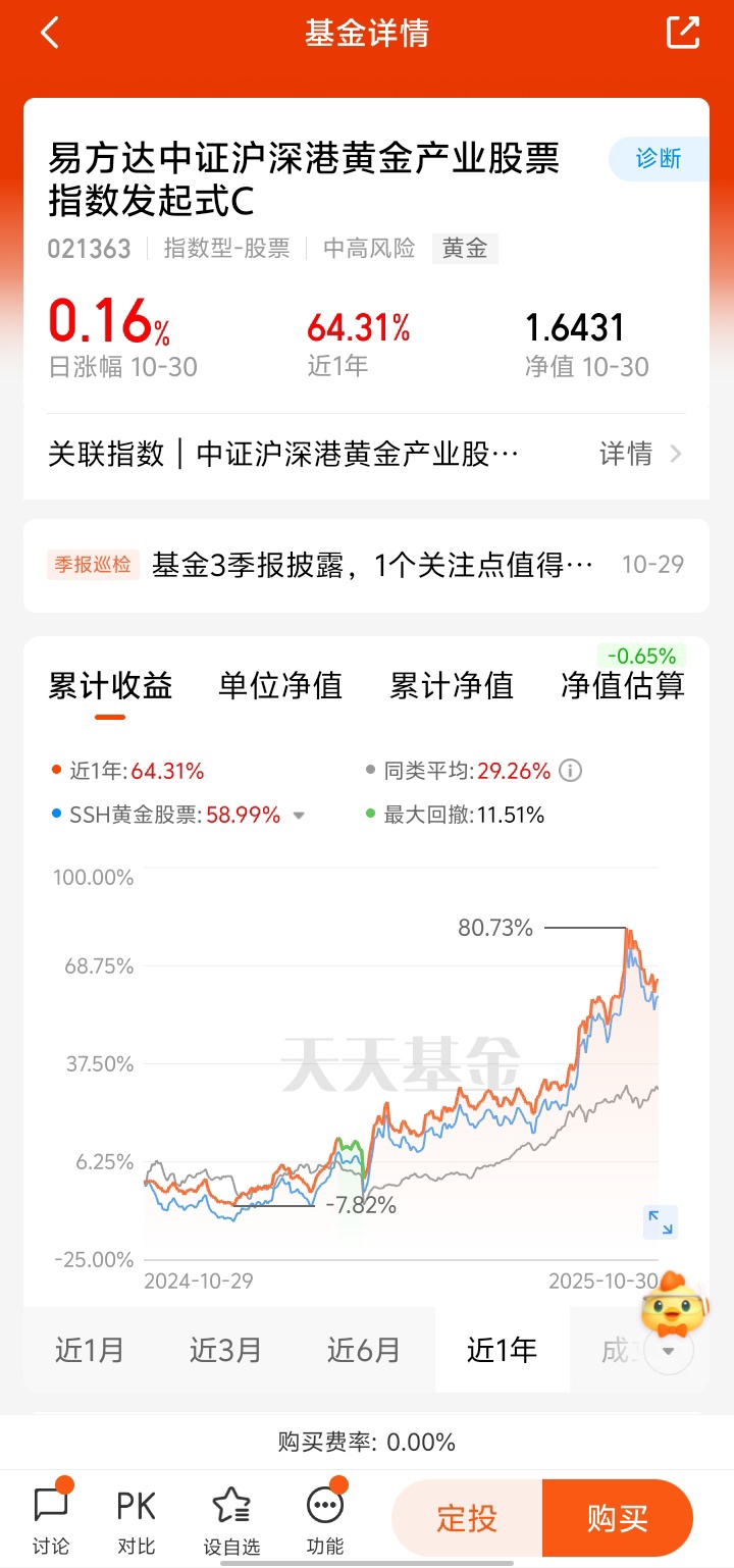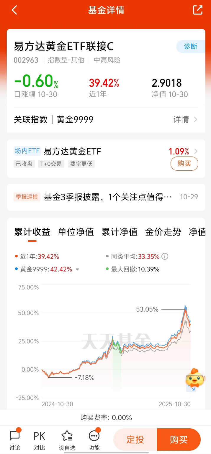 易方达黄金ETF联接C基金为黄金ETF联接基金,90%以上资产投资于易方达黄金ETF(518880),而后者直接持有上海黄金交易所Au99.99黄金现货合约,净值与金价走势高度一致。投资者无需直接购买实物黄金,即可参与黄金市场,避免保管、鉴定成本。