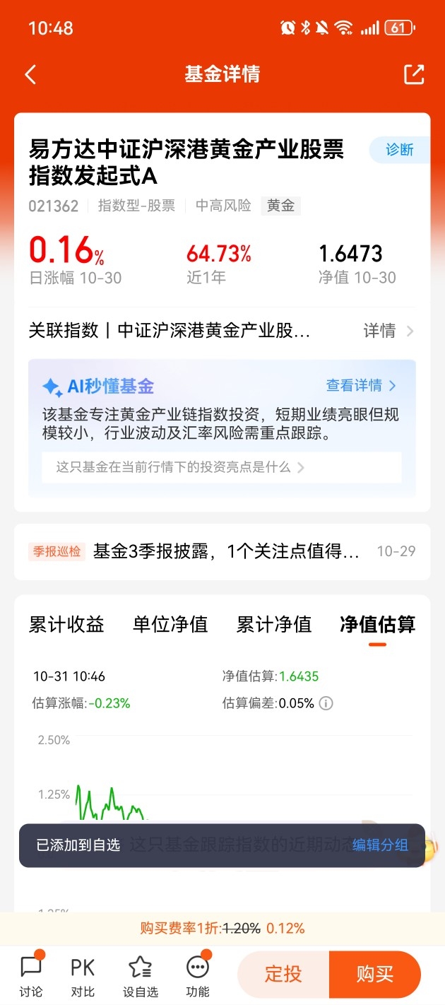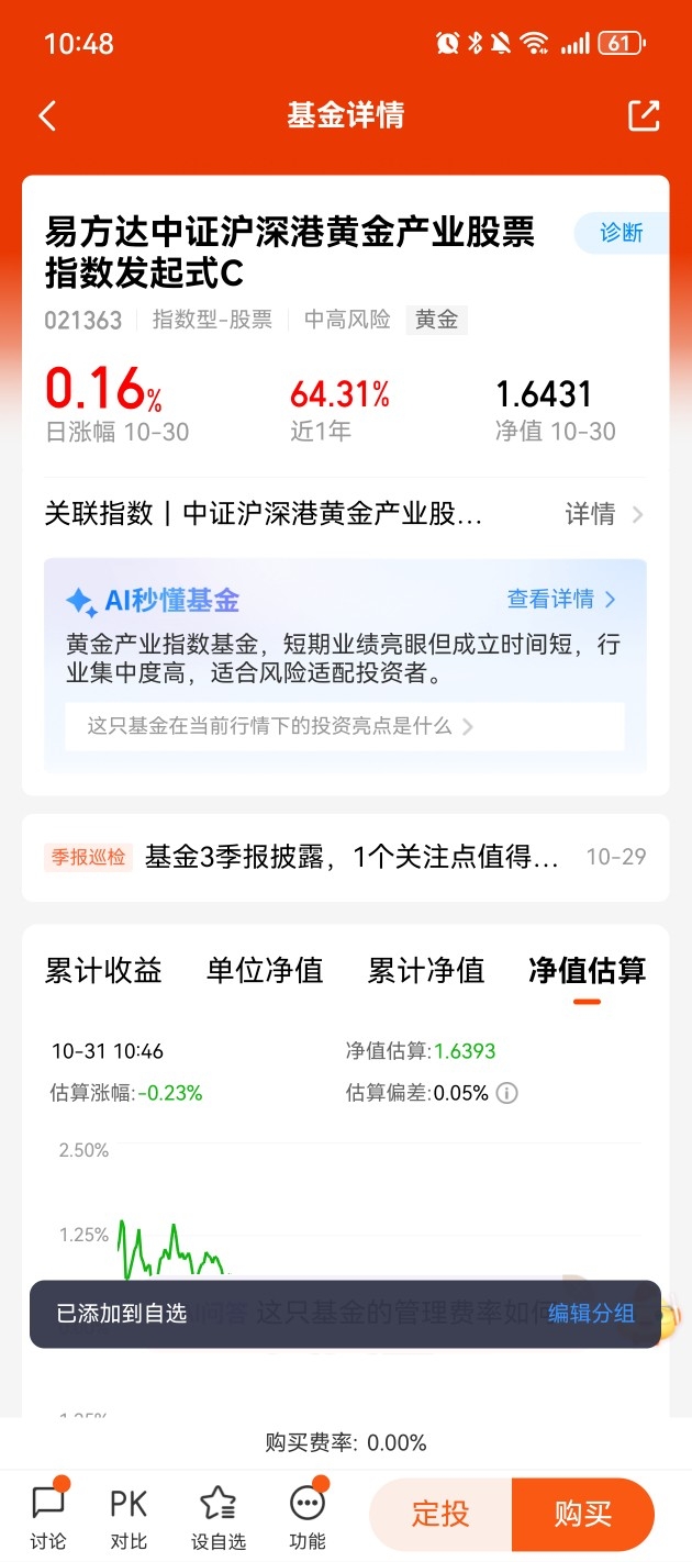 面对多样的黄金投资产品,投资者需按需选择:实物黄金优势在于无信用风险、直观可控,但保管成本高、流动性较弱;黄金ETF及联接基金则具备成本低、流动性好、投资门槛低的特点,更适合普通投资者。以易方达黄金ETF联接C为例,其通过投资易方达黄金ETF(518880)间接持有AU99.99实物黄金,净值与金价高度联动,近一年收益率达40.02%,波动率14.48%、最大回撤-10.39%,表现优于70%同类基金,2.16的夏普比率彰显高投资性价比。