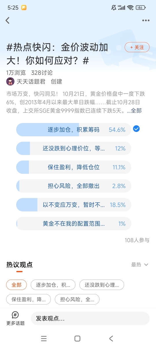 我在#热点快闪:金价波动加大!你如何应对?# 选择了“逐步加仓,积累筹码”
