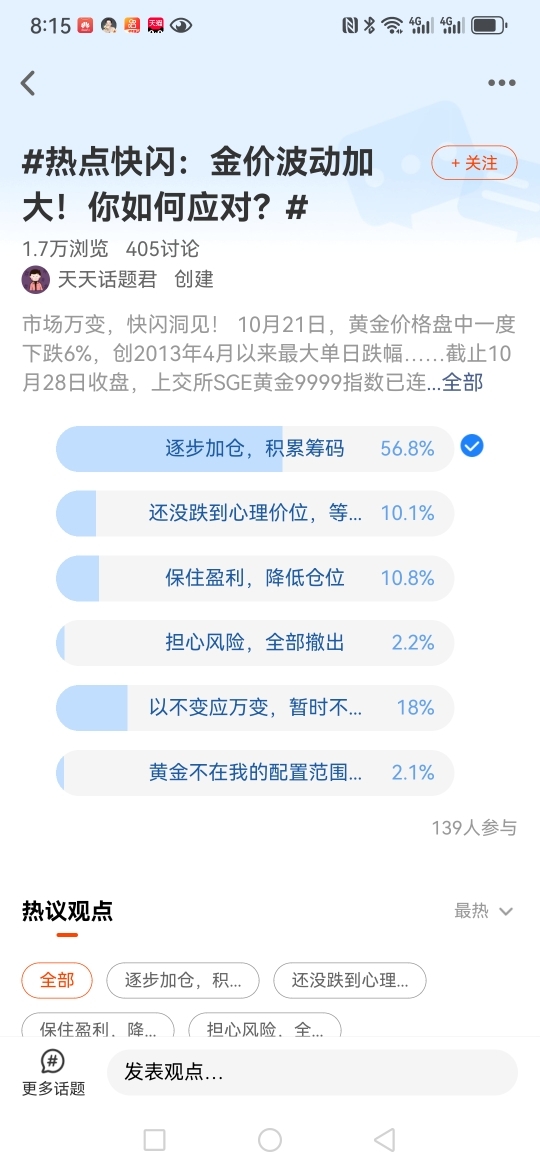 我在#热点快闪:金价波动加大!你如何应对?# 选择了“逐步加仓,积累筹码” 。
