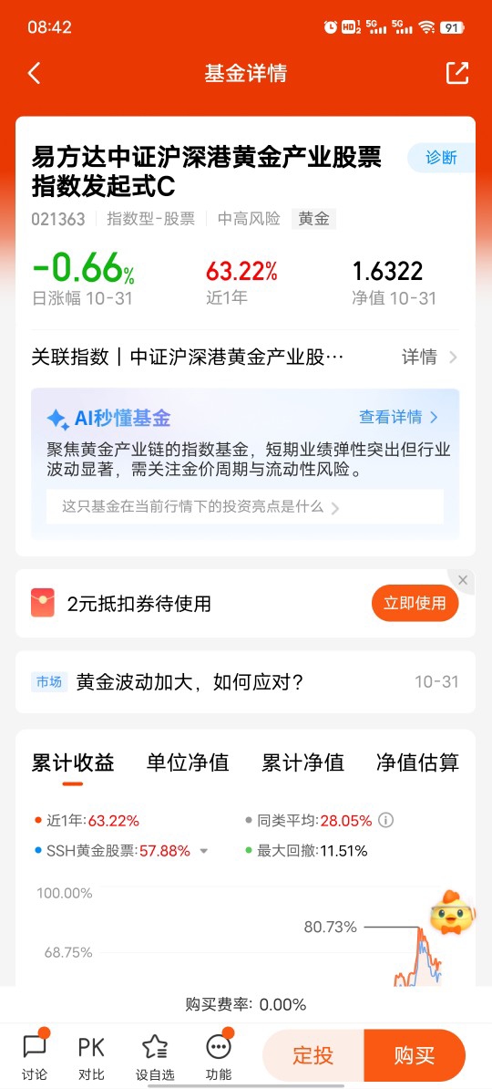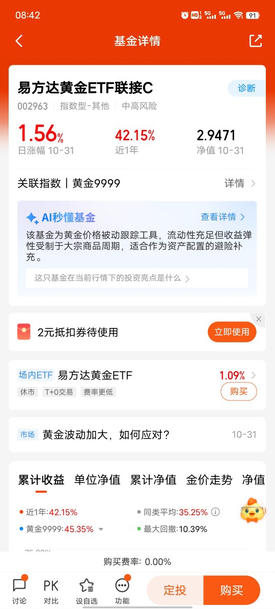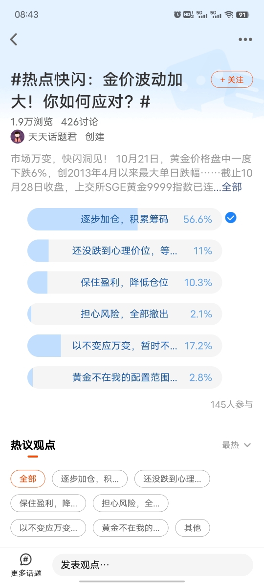 我选择“逐步加仓,积累筹码”,我打算以定投黄金相关基金的方式来加仓,从长期来看,黄金类资产是值得长期持有的,而目前看黄金又处于上涨周期内,虽然短期内可能会有波动,但不影响它长期上涨的走势。选择定投的原因是,我们无法判断它短期内是上涨还是下跌,因为影响黄金价格的突发因素太多,所以我认为定投的方式是比较稳妥的,不管是上涨还是下跌,定投都是最好的选择。$易方达黄金ETF联接C$ @易方达基金