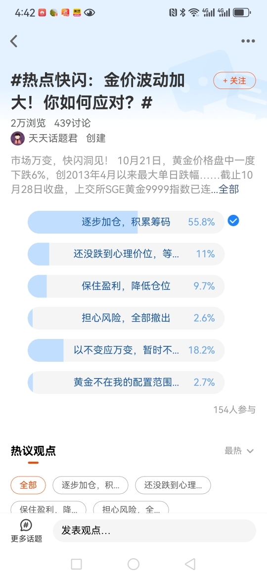 我在#热点快闪:金价波动加大!你如何应对?# 选择了“逐步加仓,积累筹码”