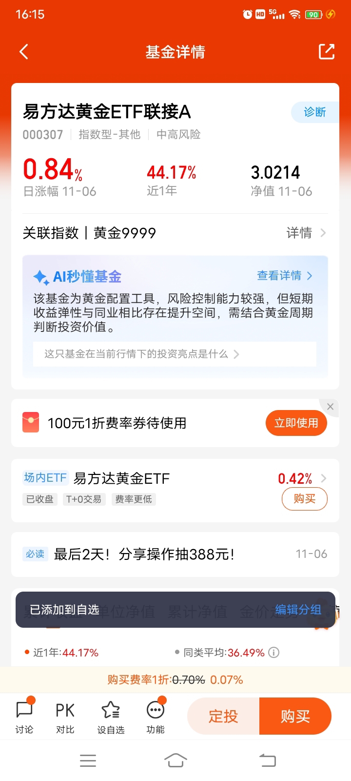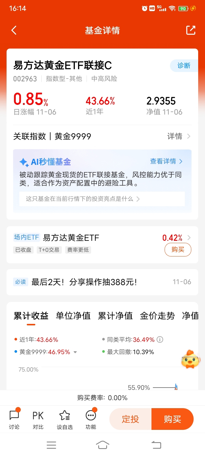 说实话,选这只ETF联接C还有个私心:它是被动跟踪黄金现货的,不用操心基金经理择时,费率还低,比自己买实物黄金方便多了。而且从走势看,它跟金价的贴合度很高,黄金涨它跟着涨,回调的时候也没跌得更狠,这种“稳跟趋势”的特性,刚好适合我这种想长期拿黄金、又不想承担太高风险的投资者。
