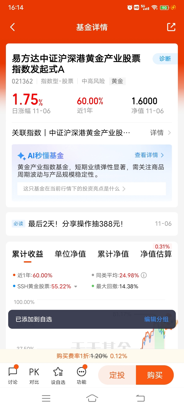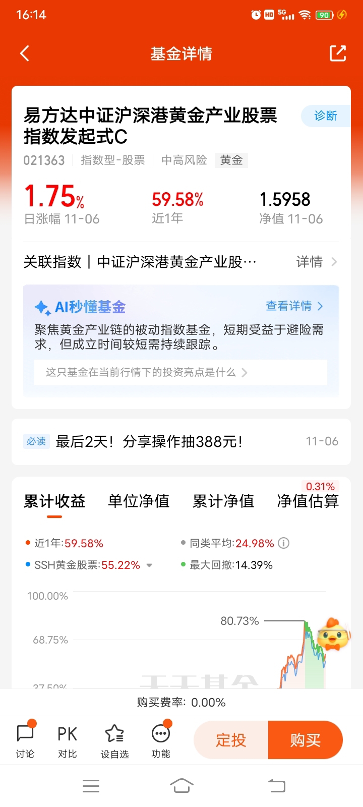 其实月初看着金价从高位跌超10%的时候,反而觉得是个机会:前期涨得太快攒的泡沫都消化得差不多了,短期过热的交易盘也出清了,市场一回归理性,反而适合慢慢布局。就像这只基金,近一年跑赢同类平均7个多点,最大回撤才10.39%,风控比不少黄金产品都稳,刚好契合我“不追高、稳布局”的思路。