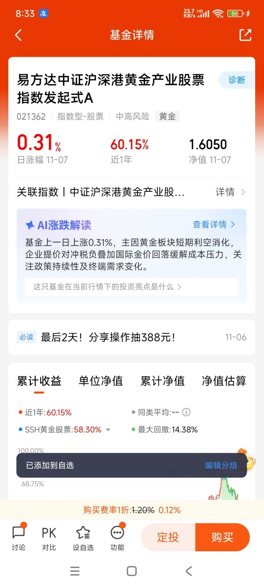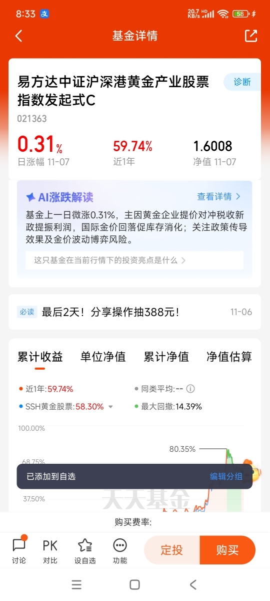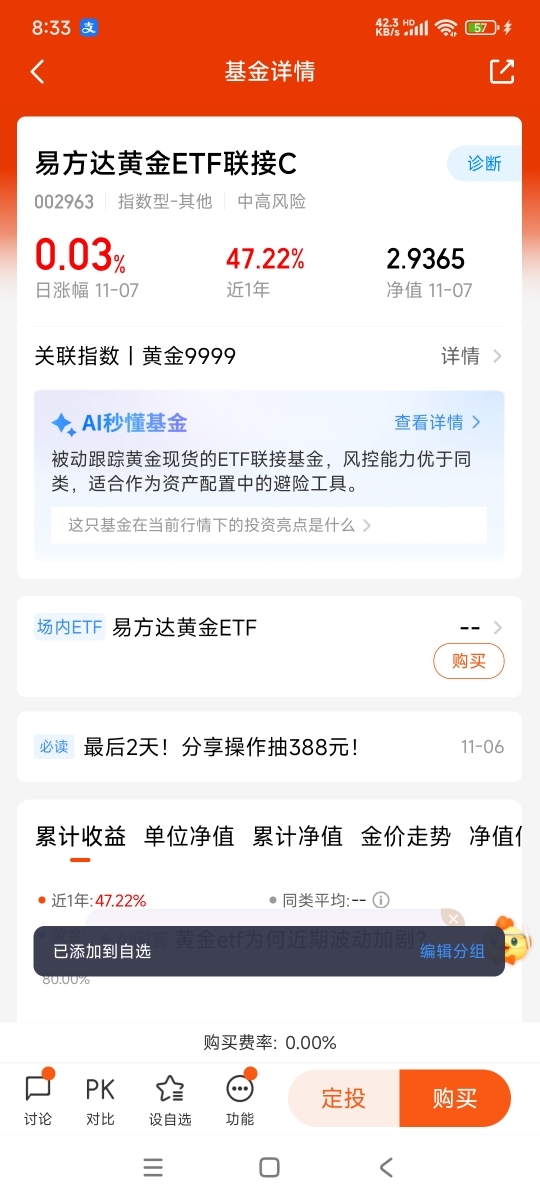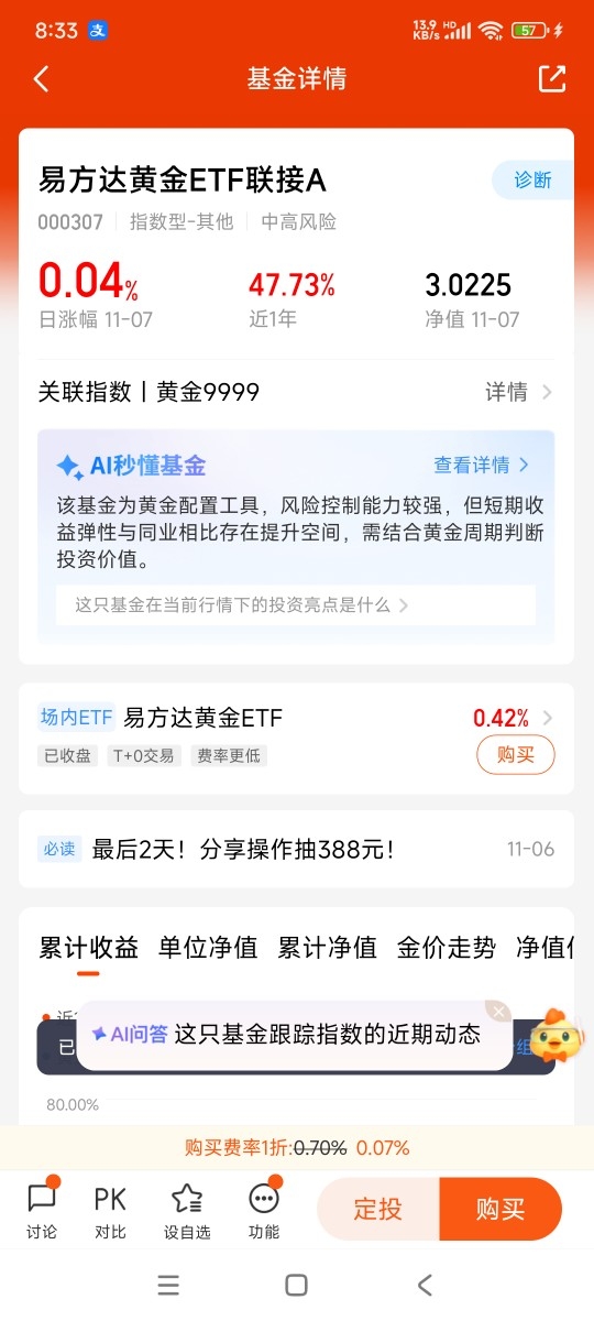 底层构成主要是易方达黄金ETF。而黄金ETF对应金库中的实体黄金。结构确保价值有实体支撑。避免成为纯数字游戏。费用相对较低。管理费和托管费合计年化约0.6%。长期持有能节省不少成本。