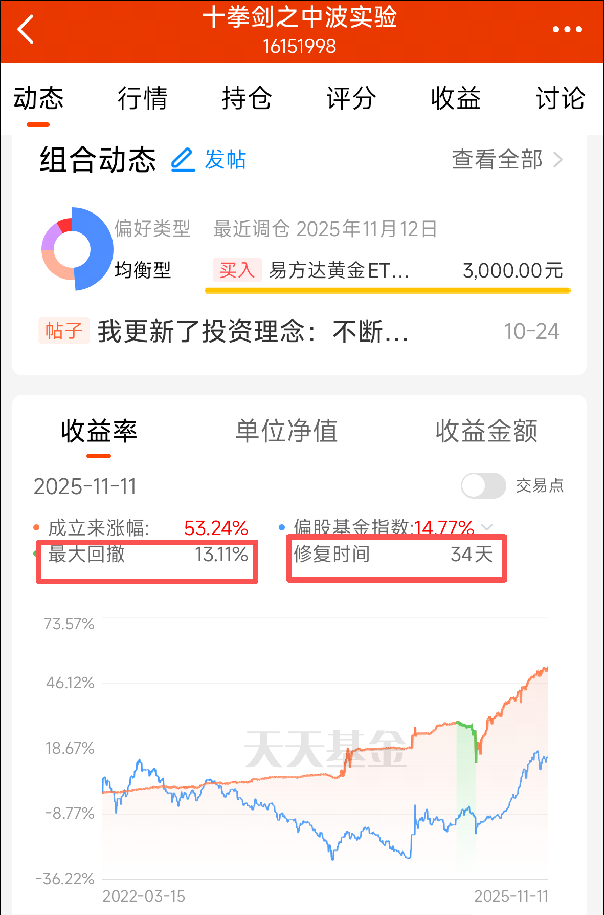 天天基金悄悄上线了新功能:可以查看组合的最大回撤和修复时间了!