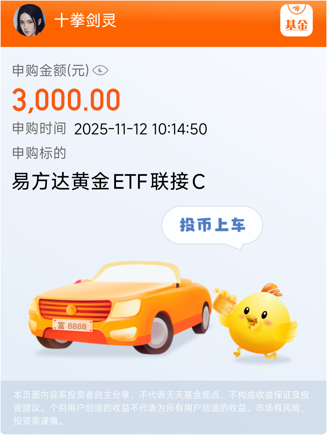 目前还小亏一点点,再加3000块的易方达黄金,摊薄平均成本:
