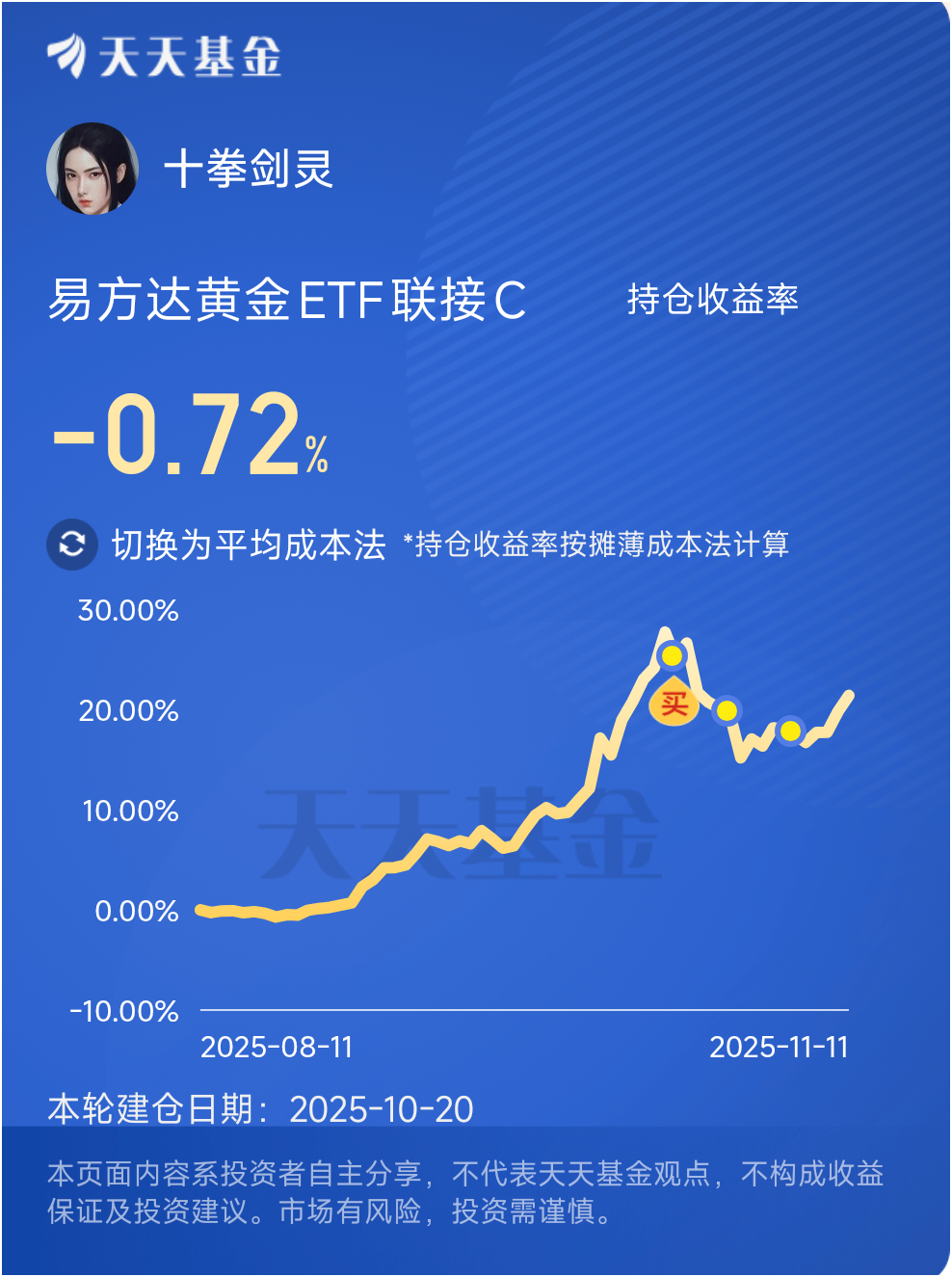 近一个月,黄金经历了较大的调整,咱们也都在持续加仓$易方达黄金ETF联接C(OTCFUND|002963)$等规模较大、业绩稳定、抗冲击力较好的联接基金,增加组合的稳定性。黄金也不负众望,开始进入到微笑曲线的右侧: