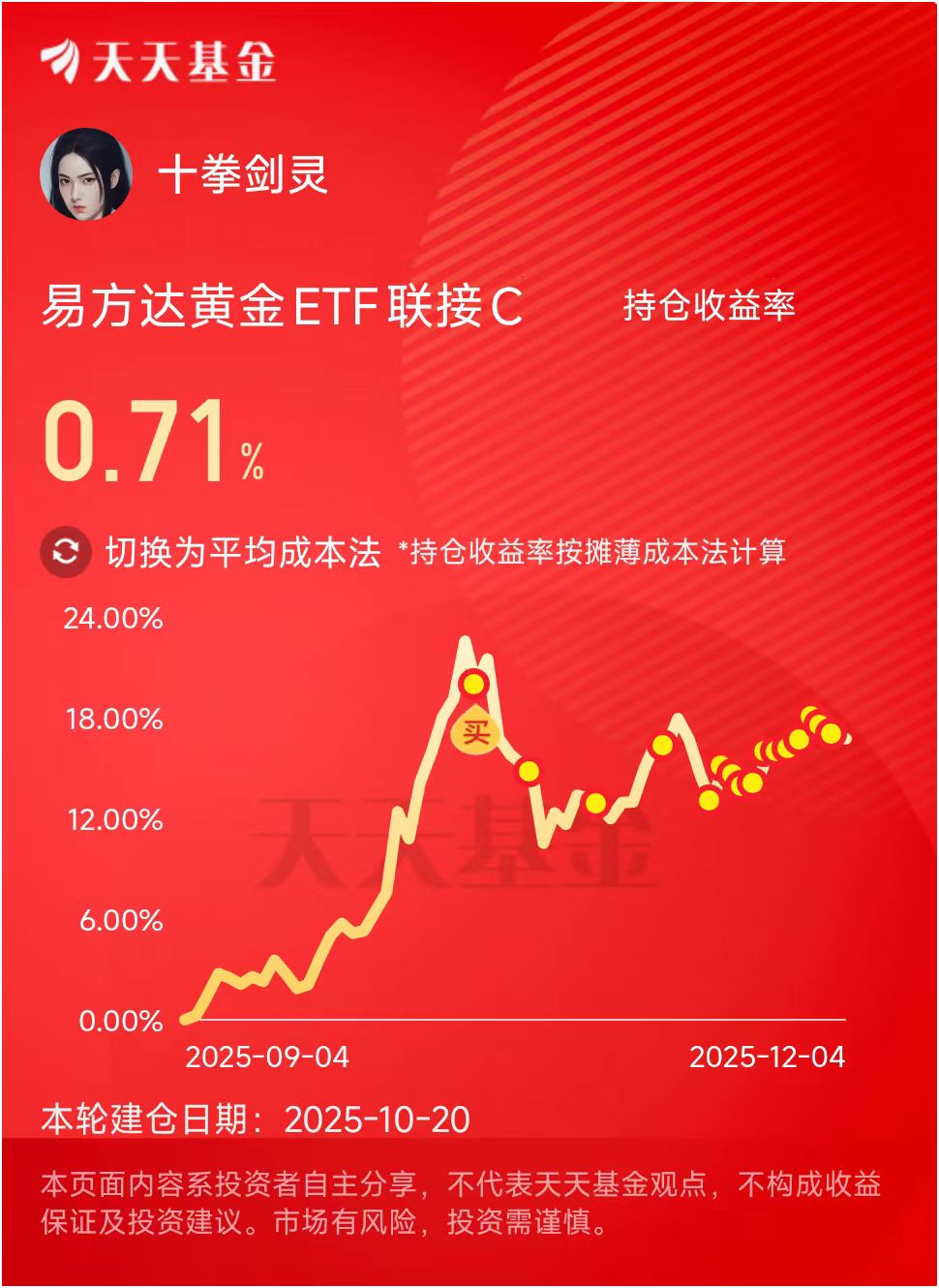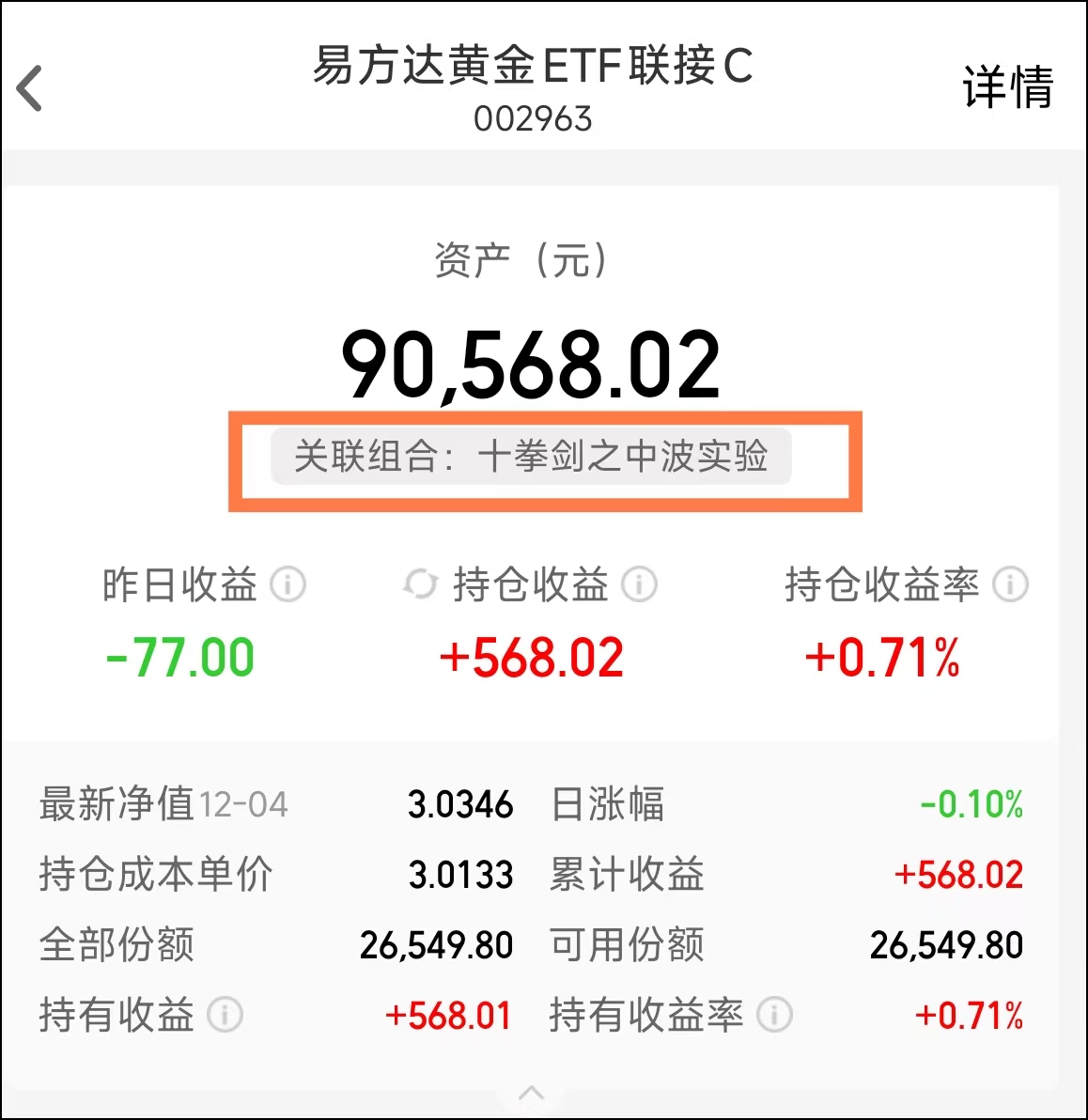 比如近两年大家开始关注到的黄金ETF,就是组合中非常重要的资产。黄金作为传统的避险资产,在市场波动或通胀上升时往往表现稳健,能有效对冲股票等风险资产的下行压力,但很多人都严重欠配了。我一直都在组合中配置10%到15%左右的黄金,跌破10%了就加点,涨到15%以上了就减点。以近期我在“十拳剑之中波实验”这个公开实盘中持续加仓了快十万的$易方达黄金ETF联接C(OTCFUND|002963)$为例,它作为跟踪黄金价格的工具,具有流动性好、交易成本低的特点,适合普通投资者便捷参与黄金投资。这只产品跟踪误差小,且规模较大、运营稳定性较高,让我放心。目前黄金的价格还没有收复回撤,计划再继续定投一段时间,走完微笑曲线的右侧。