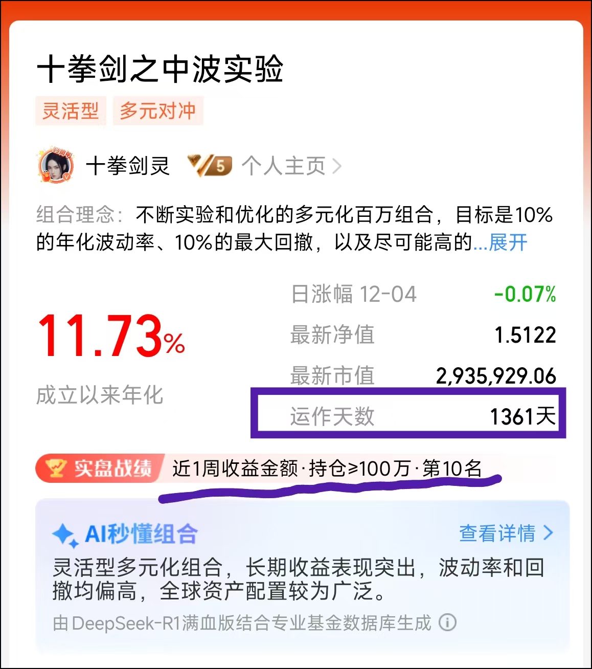 资金最多的是中等波动的组合,已经公开运行4年,年化11.73%,最新市值293万: