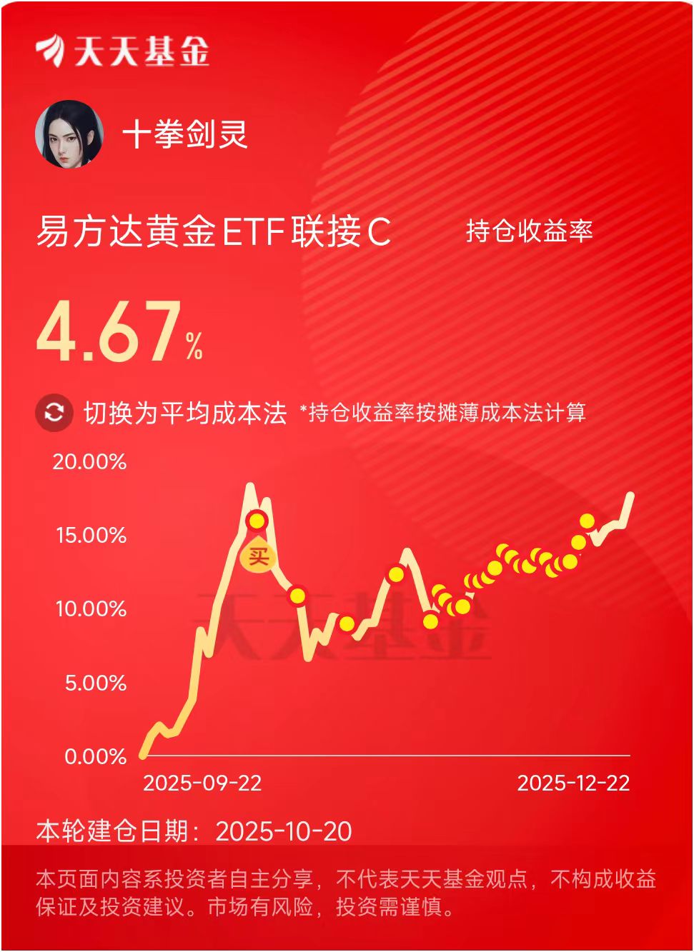 一个多月下来,账户里又积累了十几万的黄金资产,遇到黄金创新高也能跟着喝汤吃肉了。截至昨晚,一度亏损的$易方达黄金ETF联接C(OTCFUND|002963)$赚到5500多块钱了!易方达黄金etf联接这个产品啊,说白了就是主要投资上海黄金交易所的黄金现货,金价涨它就跟着涨,关系挺直接的。我选C类份额,是因为它买卖更灵活些,适合我这种可能拿一阵子,也可能根据情况动一动的人。选的这个etf联接产品费率便宜、规模大、跟踪误差小,不像黄金首饰等有加工费等折损。另外,易方达经常跟天天基金合作,发放些基金满减券什么的,C类可以直接抵扣本金。