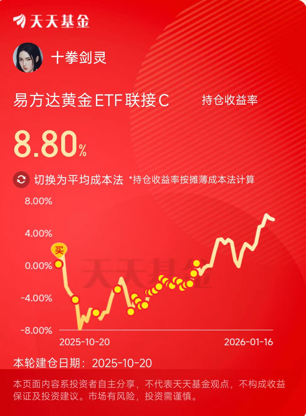 我最早是10月建仓了易方达黄金。当时看它跟踪的黄金指数回调了点,就先小买了一笔。后面它又往下走,我也不慌,继续定投买入了十几万。今天回头再看,当初的追高又变成低点了!