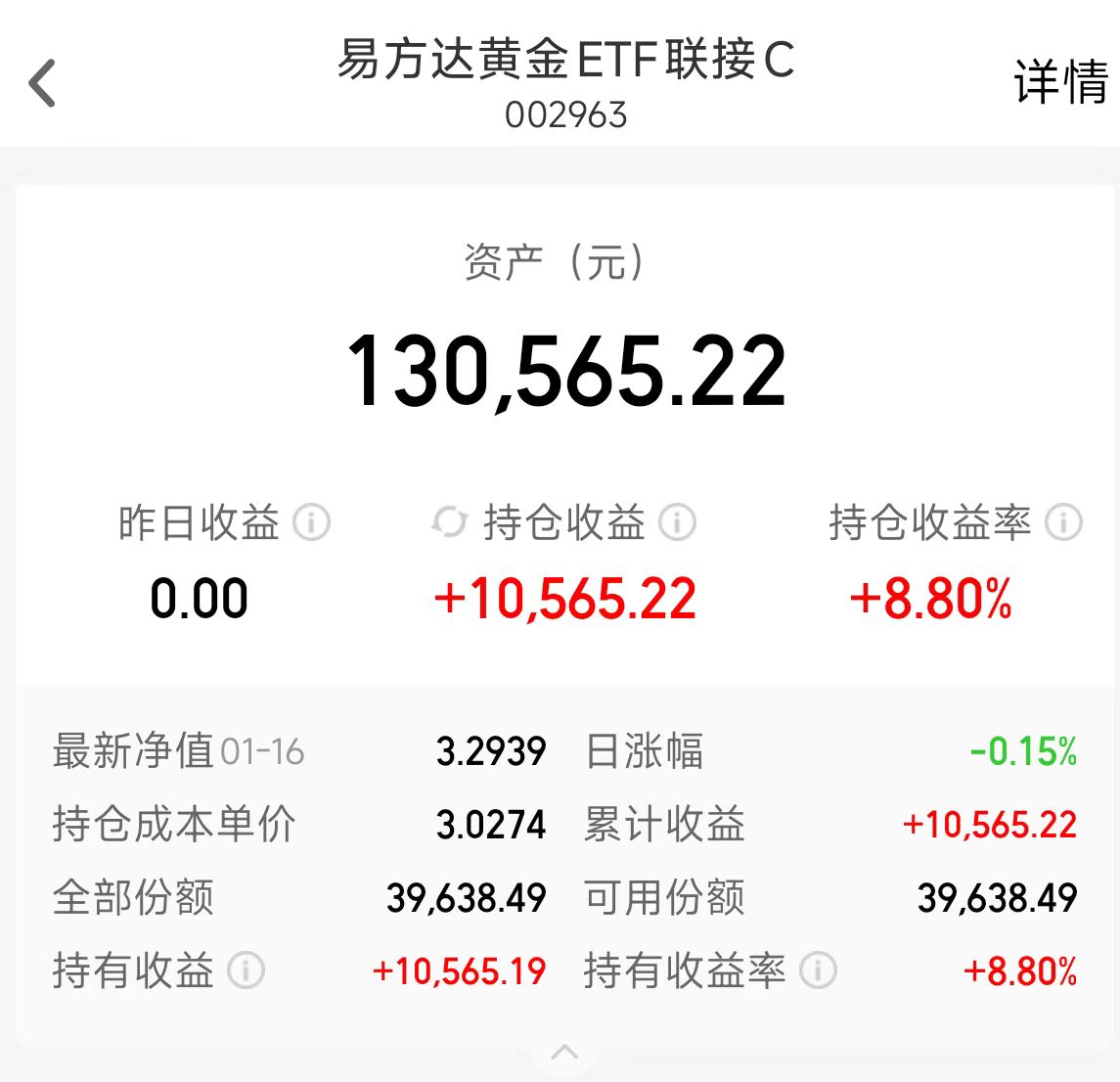 账户中一直持有10%到15%的黄金etf,重仓了$易方达黄金ETF联接C(OTCFUND|002963)$。买这只etf联接基金,图的就是省心,手机上点几下就行,不像黄金首饰有折损。选的C类,没有申购费,同时易方达这只又是个规模大、跟踪误差小的指数联接型产品,以后可能还会受益于基金费用新规的长期持有降费政策。