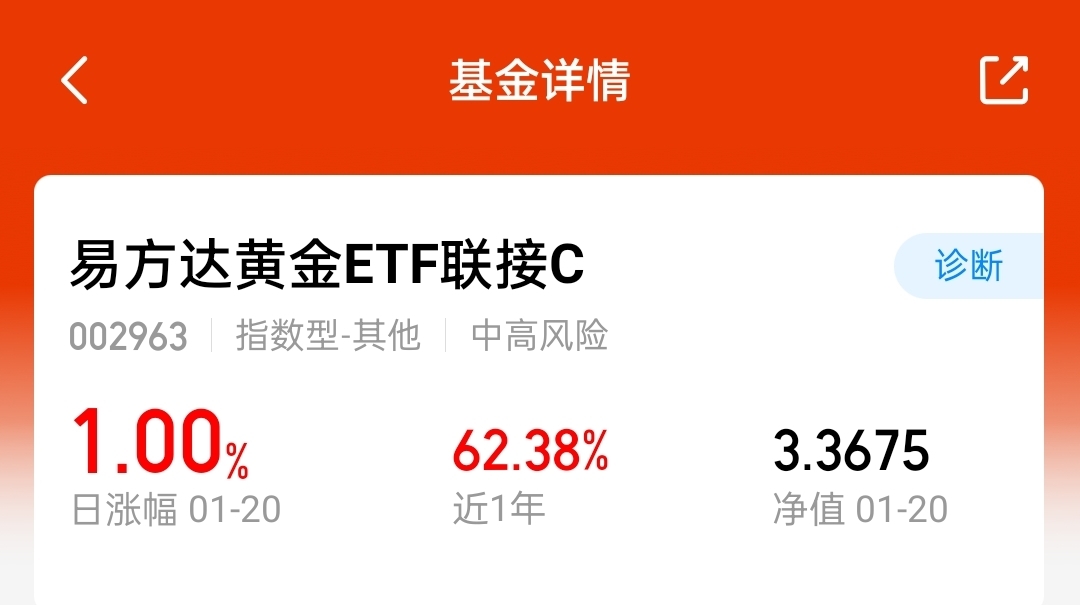 易方达黄金ETF联接C,近一个月涨超8%,近一年涨幅62.38%。