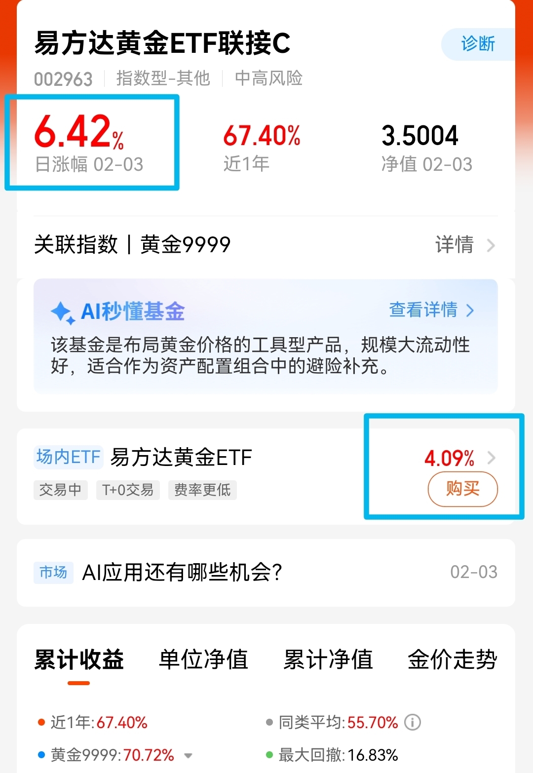 $易方达黄金ETF联接C$ 昨天反弹6.42%,今天实时涨幅4%+。黄金市场的需求基本面没有改变,全球央行购金、私人投资者增持黄金从而多元化资产配置仍是推高金价的主要力量,继续看好资源类的反弹空间。