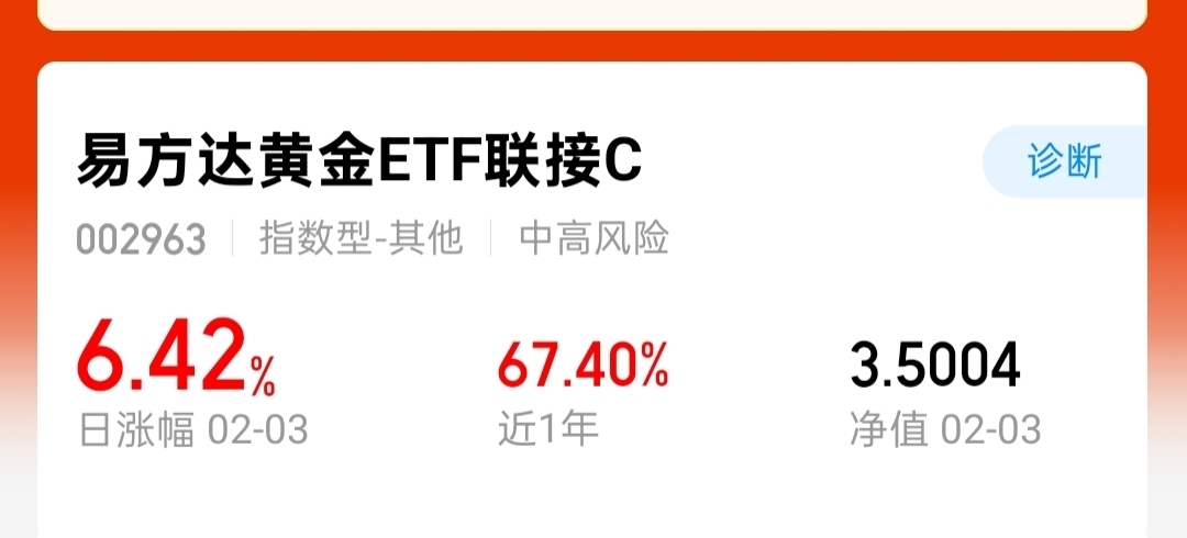 易方达黄金ETF联接C,周二大涨6.42%,近一年涨超67%,黄金市场出现反弹,
