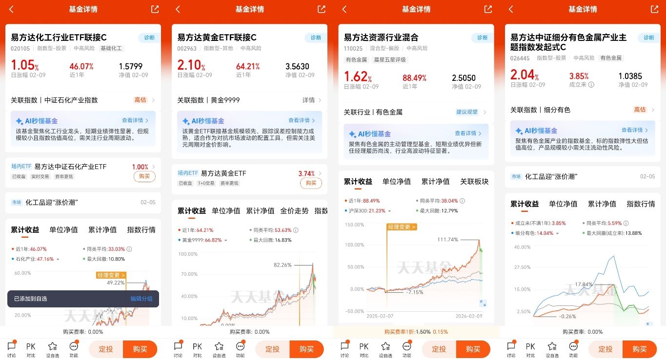 相比工业金属和石油化工,黄金受单一产业或周期影响更小,在当前不确定性较强的环境下,抗风险和抗通胀属性更突出,对追求稳健的我来说,当下配置性价比更高。$易方达黄金ETF联接C$ $易方达中证细分有色金属产业主题指数发起式C$ $易方达资源行业混合$ $易方达化工行业ETF联接C$ @易方达基金