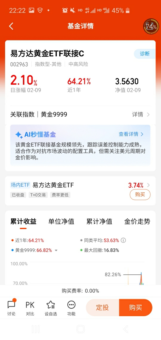 只要以上因素一直存在,黄金就有望在振荡调整后继续走高,持续上涨。黄金投资是资产均衡配置的重要组成部分。相比金条、黄金首饰,黄金ETF联接基金不失为一个灵活便捷的选择。$易方达黄金ETF联接C(OTCFUND|002963)$,紧密跟踪9999黄金现货涨幅,10元起购,0申购费,买卖灵活。近1年收益达到64.21%,绝对值得配置!@易方达基金