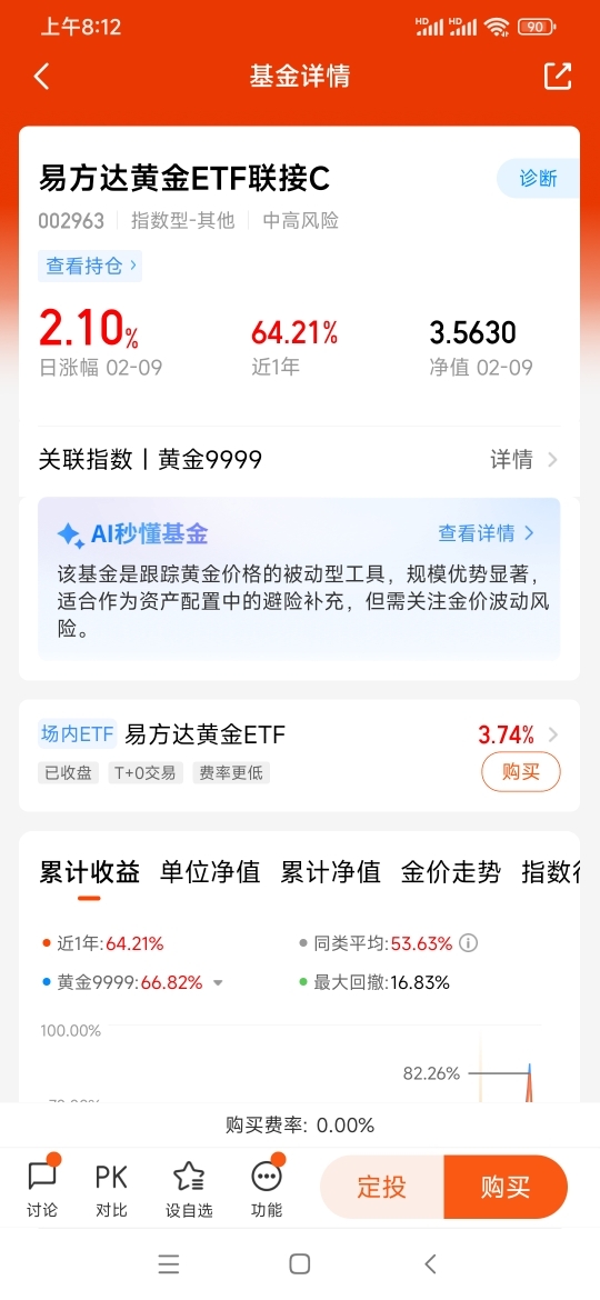 最后,选对基金,普通人布局黄金才能省心又划算。我持有的易方达黄金ETF联接C(002963),紧密跟踪上海黄金交易所Au99.99现货价格,近一年涨幅64.21%,跟踪效果精准。产品费率友好,持有满30天免赎回费,小额分批投入无压力。易方达基金平台实力雄厚,基金经理张湛拥有丰富的指数基金管理经验,产品运作规范稳定,完全适配上班族的投资需求。