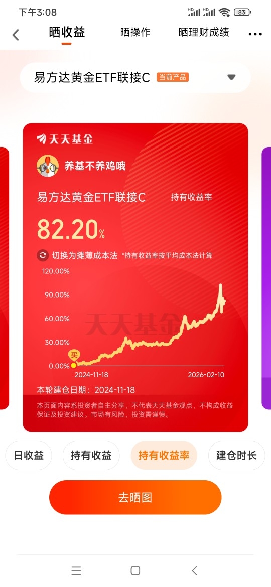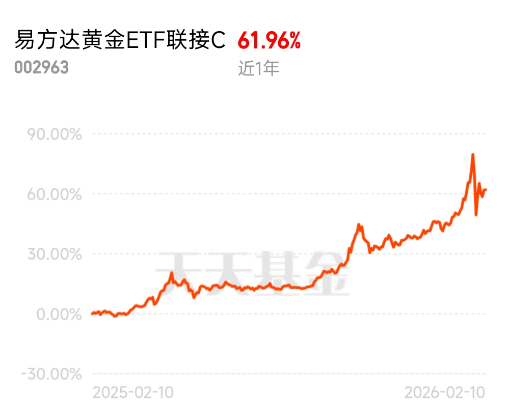 马上过年了,接下来更看好哪个投资赛道?我心里的答案一直很明确,就是黄金,而且我会继续坚定持有易方达黄金ETF联接C(002963),后续还会找合适的机会逐步加仓。我在一年多之前就布局了这只基金,到现在持基收益率已经达到82.20%,这样的收益表现对于我这个追求稳健的上班族来说,已经非常满意。