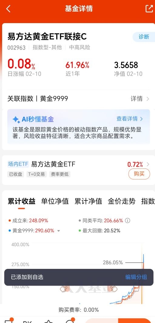 当前大宗商品超级周期未终结,仅为结构轮动中的阶段性调整,黄金凭借避险+降息双逻辑,成为配置性价比最高的品种。易方达黄金ETF联接C作为成立9年的老牌黄金指数基金,跟踪精准、费率友好、管理专业,是布局黄金赛道的优质工具。