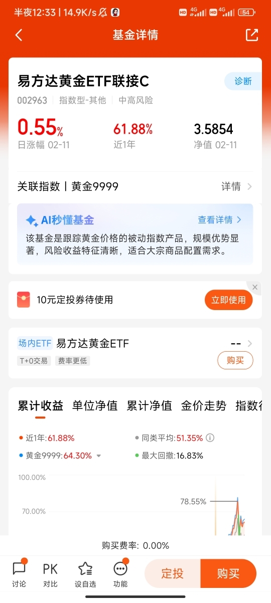 对普通投资者而言,黄金ETF联接基金是最优入场方式。易方达黄金ETF联接C紧密跟踪国内黄金现货价格,跟踪误差小,一键把握金价上涨收益,免去实物黄金保管、溢价、变现难等问题。C类份额申购零费率,持有超过30天卖出费率更低,中期布局、波段操作成本友好,小额资金也能轻松参与,适配定投与分批买入。