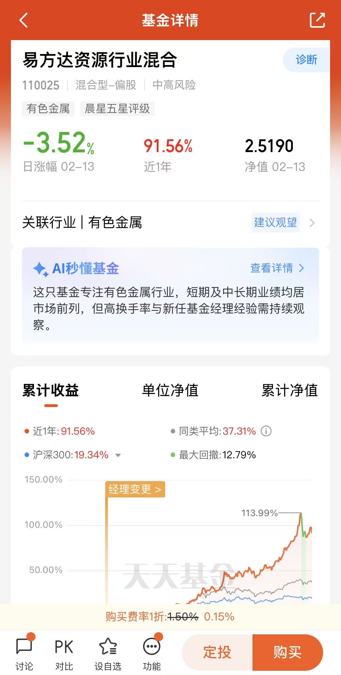(3)大宗商品宝藏基:明星基金经理朱运先生的易方达资源行业混合(110025)专注有色金属行业,受益于资源行业景气度,大幅取得超额收益。易方达资源行业混合(110025)“近1年”阶段涨幅高达91.56%,远超同期沪深300指数的19.34%,在4483只同类基金排名达到第148位。