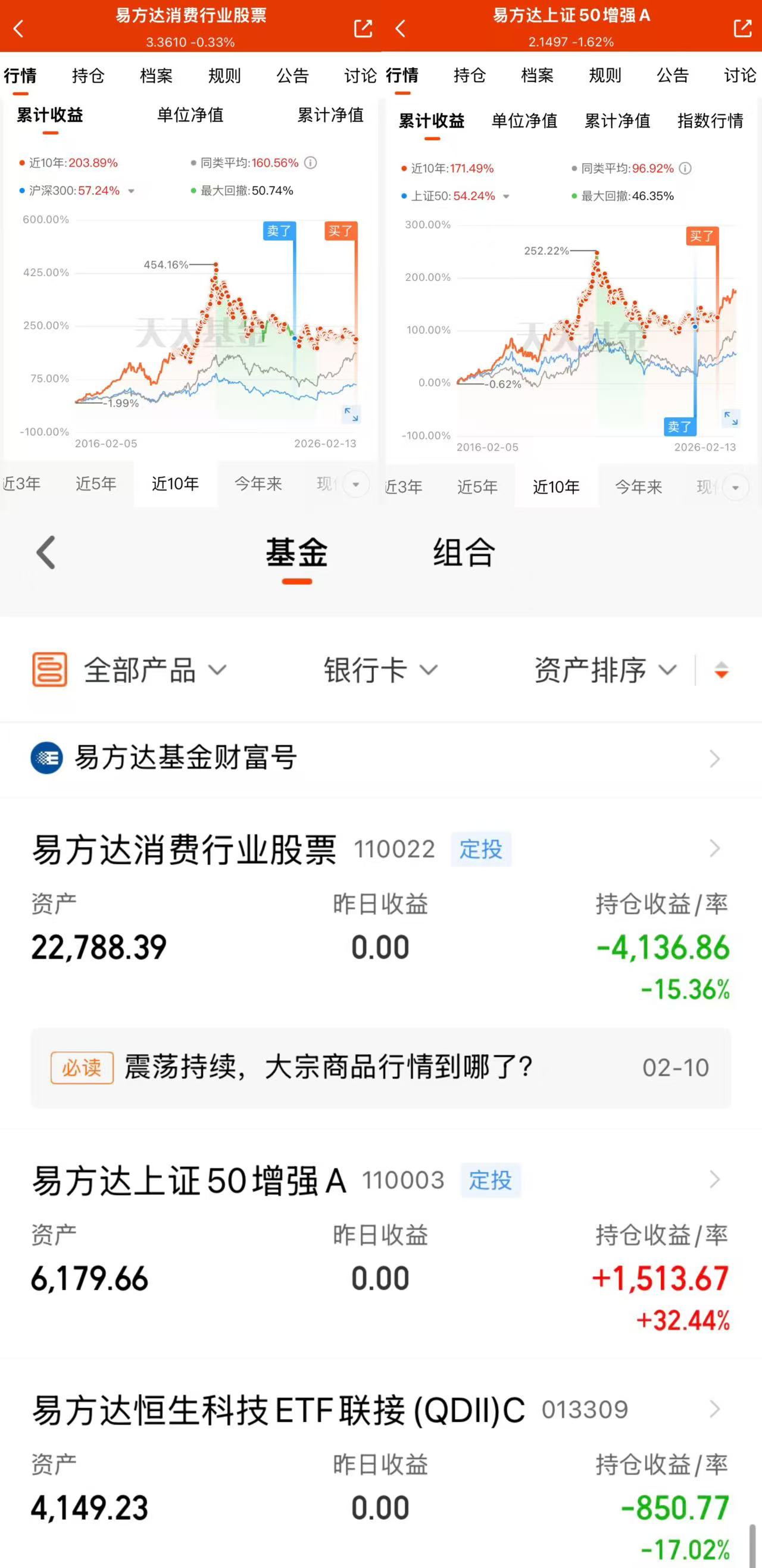 同时,在天天基金网我又设立了多只易方达基金的“慧定投”计划,以金牛基金经理张胜记先生的大盘指数宝藏基金——易方达上证50增强A(110003)的红利资产作为底仓“核心”,以金牛基金经理萧楠先生和王元春先生的宝藏行业主题基金——易方达消费行业(110022)的成长资产作为增收“卫星”,从2019年定投开始,坚持至今都将近7年时间,不可谓不长情。同时,我还持有易方达恒生科技ETF(QDII)C(013309)。虽然,尚未取得正收益,但依然会坚持下去春种静待秋收!