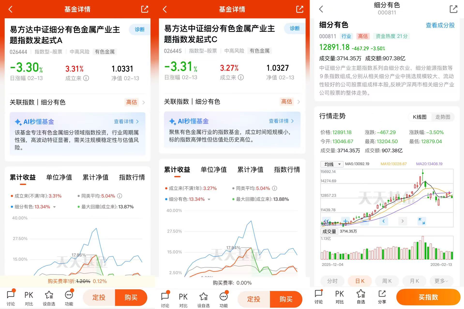 (4)有色金属主题基金:金牛基金经理刘文魁先生的易方达中证细分有色金属产业主题指数发起式(A:026444;C:026445)紧密跟踪中证细分产业主题指数(000811),从相关细分产业中挑选规模较大、流动性较好的公司股票组成。