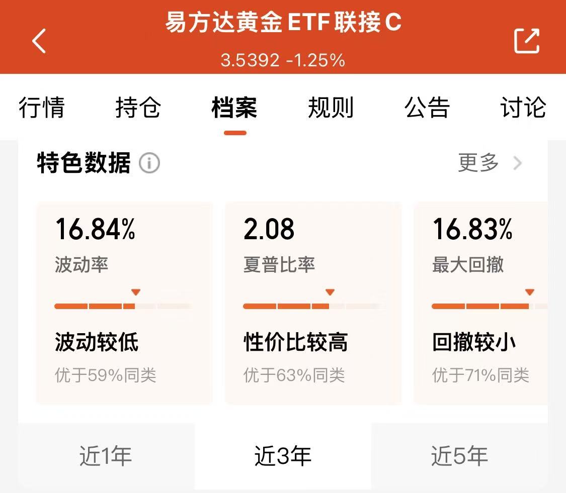 (2)再来看波动性。易方达黄金ETF联接(A:000307;C:002963)的“近3年”夏普比率2.08,“性价比很高,优于63%同类”。