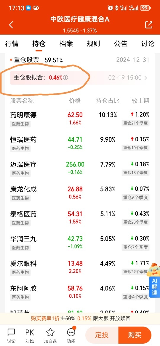 医疗ETF今天涨了1.16%,噶烂中欧必尿今天重仓拟合0.46%,大伙来猜猜,今晚实际更新后的涨幅会不会达到0.3%。