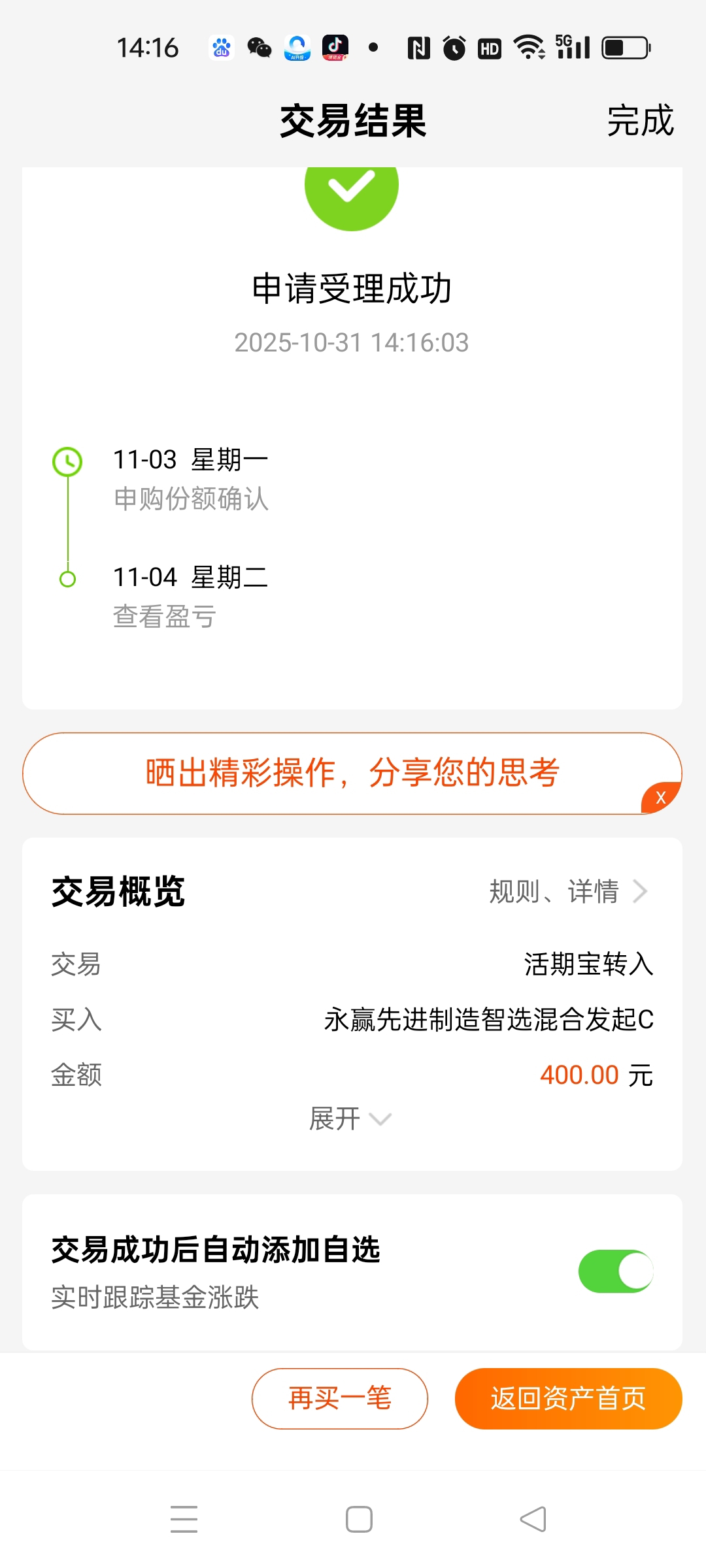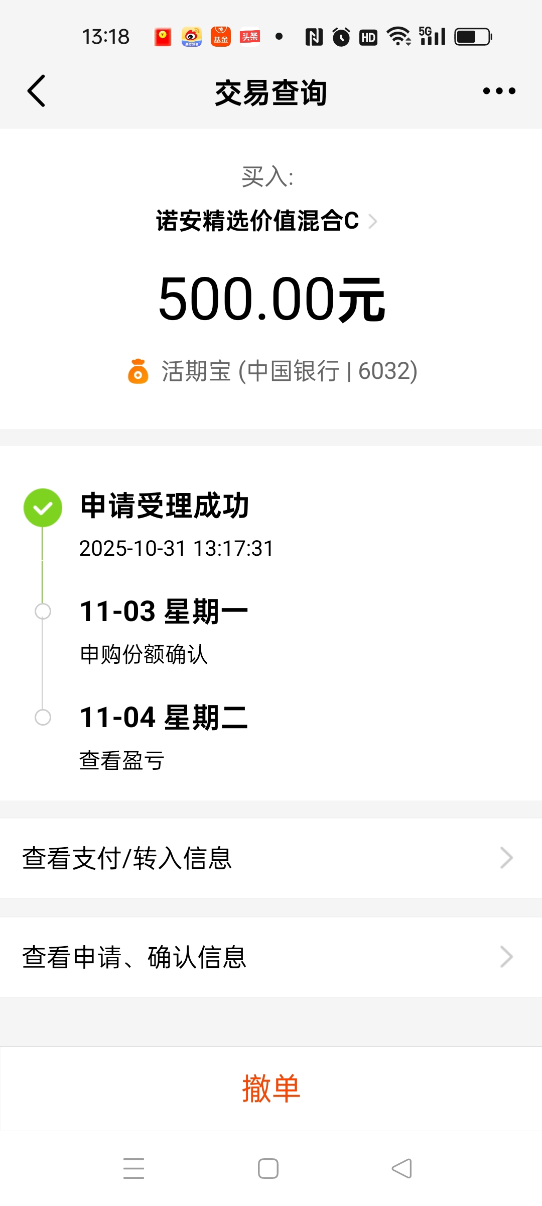 哈哈,昨天高开低走,可惜我昨天还把北证50基金给抛了三分之一筹码出来。那今天又是阳包阴的走势,非常的强势,那剩下的就老老实实的留着吧。