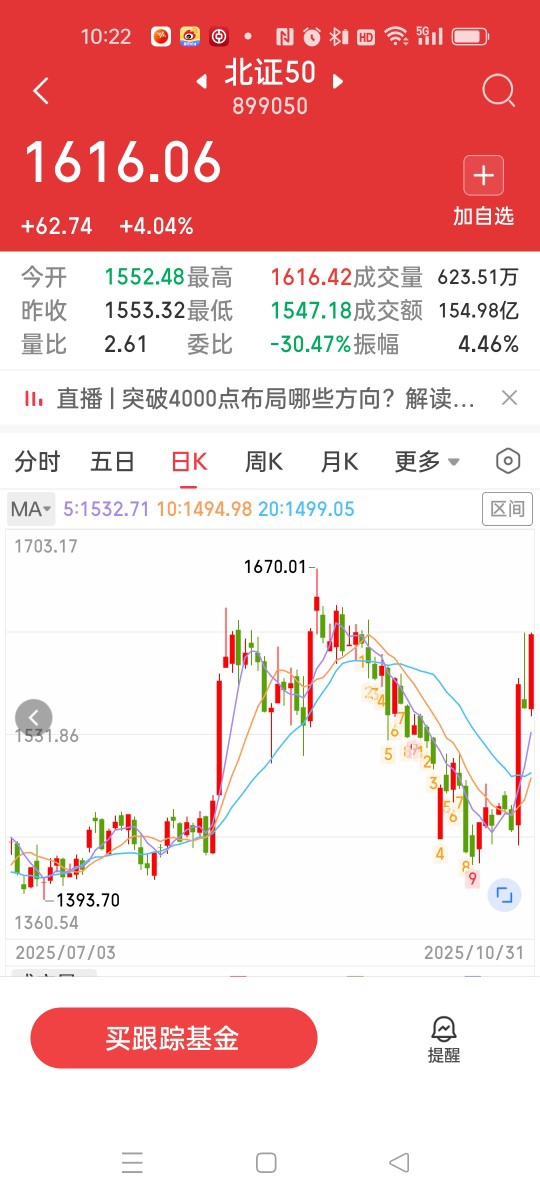还有就是北证50指数又再次飙升了。截止到上午涨10:20左右,涨60多个点,涨幅4%多些,太厉害了。