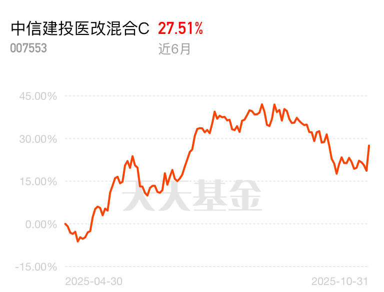 最近医疗太给劲了!板块里不少标的直线拉涨,明显能感觉到行情回来了。重点看中信建投医改灵活配置混合C,今晚大涨7.44%,近六月也有27.51%的涨幅,这收益谁不爱?$中信建投医改混合C$