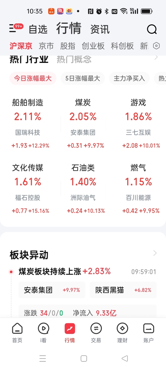 上午的热点是船舶制造、煤炭、游戏、文化传媒、石油、采掘等。