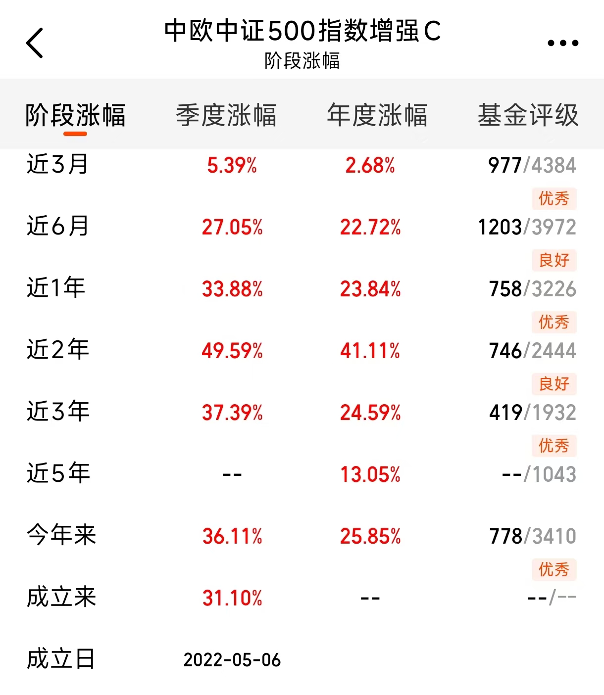 我注意到$中欧中证500指数增强C$(015454)在同类基金中表现非常抢眼。近一年收益33.88%,今年以来收益36.11%。像博道中证500指数增强C(006594)这样的产品,近一年收益就比它落后了差不多2个点。都是跟踪同一个指数,收益差距却如此之大,充分体现了中欧增强策略的有效性。近3个月涨幅还是同类第1,这基金的增强不止于口号,而是实打实领跑市场。现在中证500估值相对较低,是较好的配置时机。这样的基金,动作得快一点,别等大家都发现了才追。#低估补涨号启航#