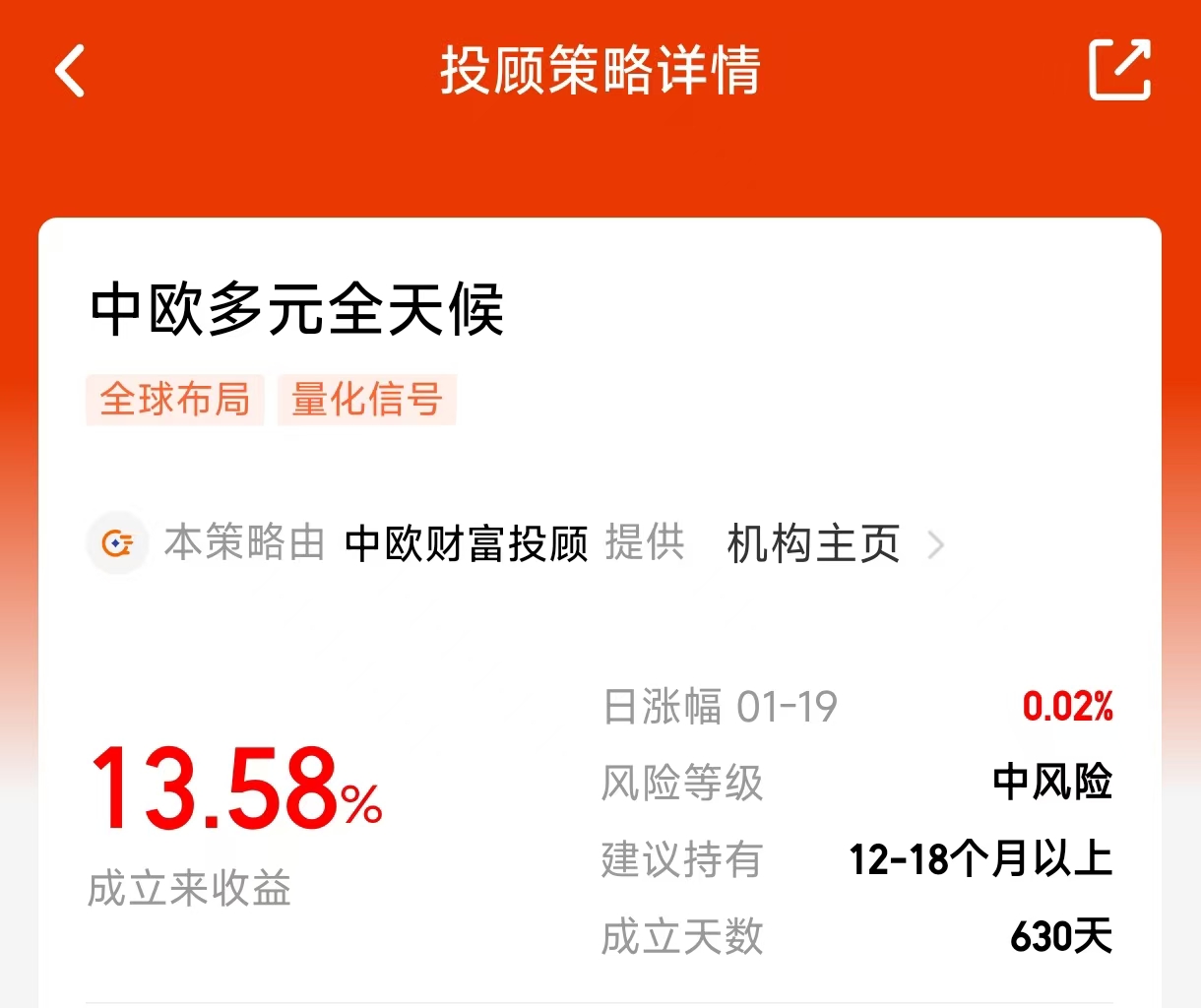 这轮市场波动,让很多固收+产品都出现了下跌,而中欧多元全天候组合近一周依然录得0.28%的涨幅。考虑到目前的市场估值水平,传统固收+策略的未来波动可能会加大,全天候策略则试图通过分散化来应对这种不确定性。它的构建思路是,以固收资产作为稳定器,增强收益的部分则进行跨市场、跨资产的全球配置,旨在利用资产间的负相关性来减少整体组合的剧烈起伏。从绩效来看,近一年收益10.36%,最大回撤控制在2.02%,波动率2.9%,这样的风险收益特征在当前环境下或许能提供更好的持有体验。据了解,目前额度是充足的。#暖阳创作计划#