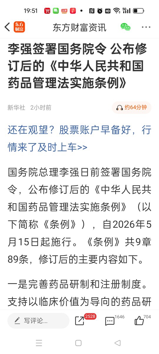 昨晚上面出台了《中华人民共和国药品管理实施条例》,内容是完善药品研制和注册制度,支持以临床价值为导向的药品研制和创新,鼔励研究和创制新药,支持新药临床推广和使用……