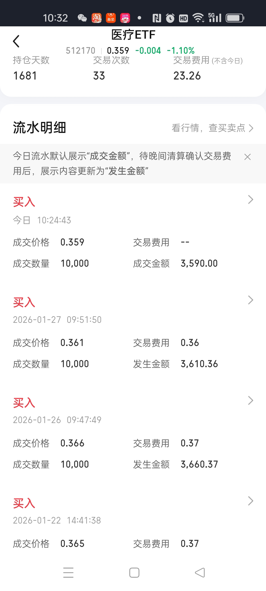 我又买了159712医疗ETF今天共买了2万份额,越跌越买,属于对前几天的0.39高抛后的回补仓位,周而复始的操作。