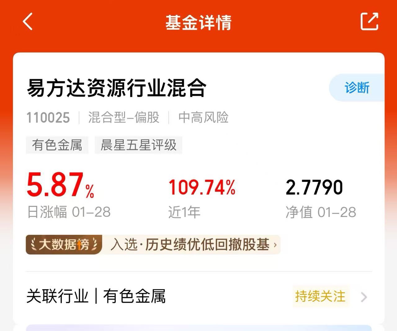 这波有色资源涨得太顶了,今天继续连涨,发现持仓集中的基涨势更猛!易方达资源行业混