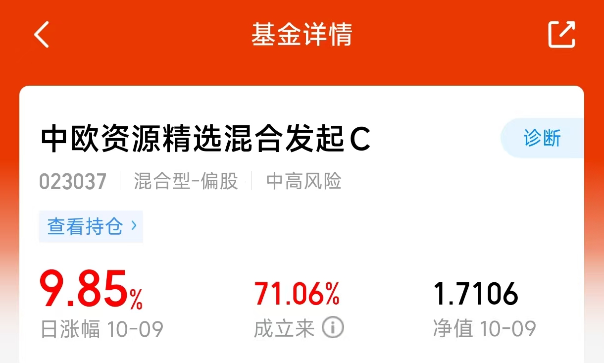 今天又是靠中欧资源精选混合发起C(023037)吃肉的一天,单日大涨9.85%,表现远超一些热门榜上的黄金产品,比如天虹上海金(014662),近半年业绩也是稳步向上,收益超过72%。我个人的操作是坚定持有,看好它的潜力,新入手的朋友记得领31.88元福利哦。这种稳健上涨的基金在当下市场真的很难得#指数操盘手集结令#
