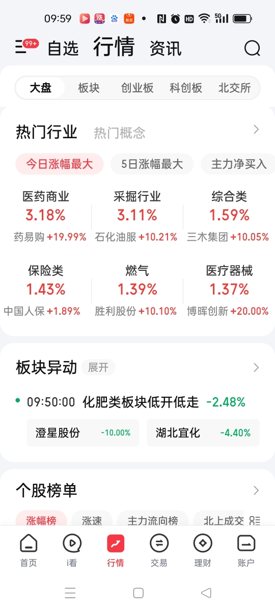 截止到上午10点左右,涨跌分布是1920:3320家。热点是医药商业、采掘行业、综合类、医疗器械、燃气、生物制品等。