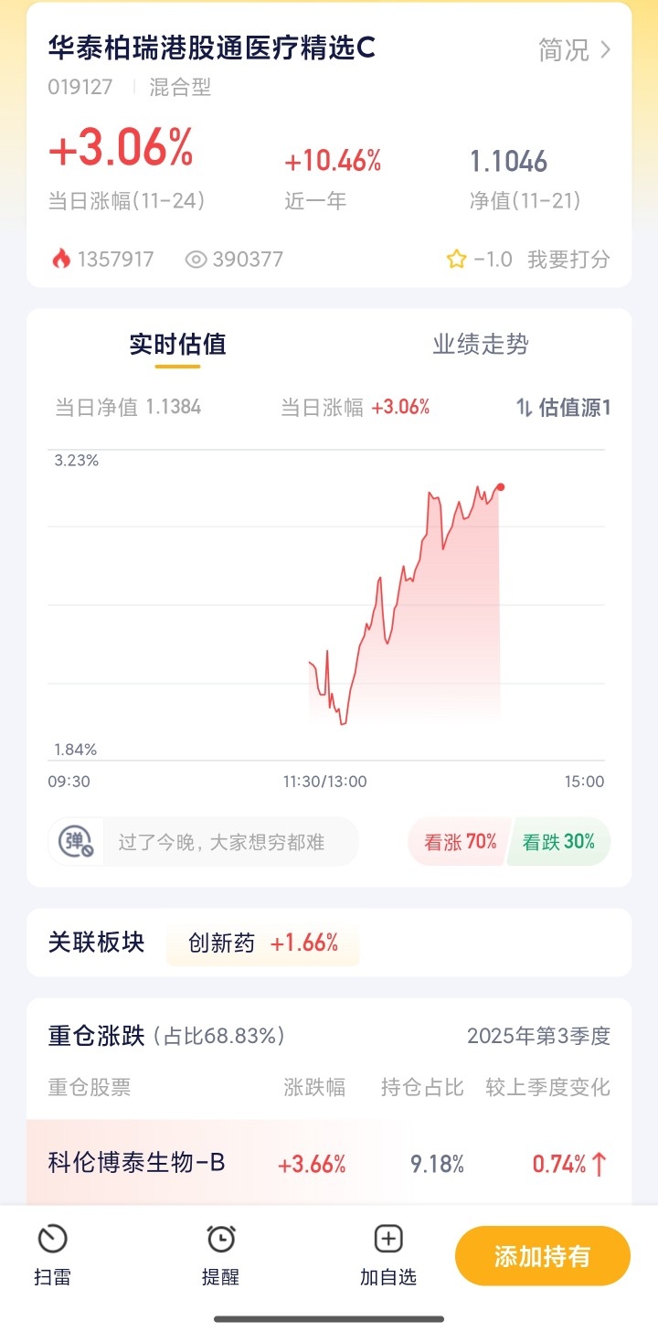 说真的,今天创新药板块的震荡调整,反而给了布局的好机会。虽然四季度板块有过不小的回撤,但政策红利一直在释放,医保支付分层改革、集采规则放宽,都让创新药企的环境越来越好。加上人口老龄化带来的持续需求,还有药企在海外市场的突破,行业长期向上的趋势很清晰。我对比了不少产品,最后选了华泰柏瑞,它专门投港股通的医疗标的,能精准覆盖创新药赛道,不用自己费心筛选个股,分散风险的同时还能享受行业成长,对于想布局医疗板块又怕踩坑的朋友,这个选择挺靠谱的。$华泰柏瑞港股通医疗精选混合发起式C$
