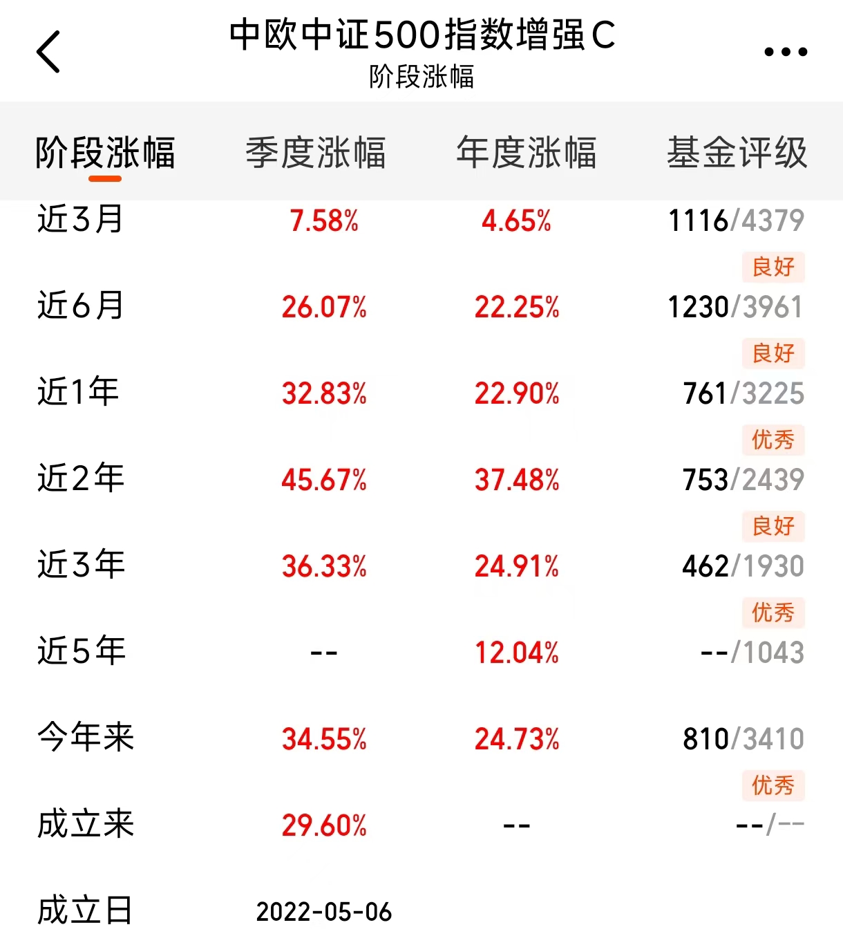 今天继续买$中欧中证A500指数发起C$(022433)。我关注它就是因为收益硬气。从近半年看,它取得了21.25%的增长。你可能会看到一些同期运作的中证A500基金,比如富国中证500指数增强(022676),收益差不多,波动却更大。说白了增强策略不仅带来的真金白银,还有持有体验的的区别,中欧这个体验就更好点。现在市场位置不算高,布局这种有超额收益能力的宽基指数基金正当时。机会不错,抓紧看看。#12月基金投资策略#