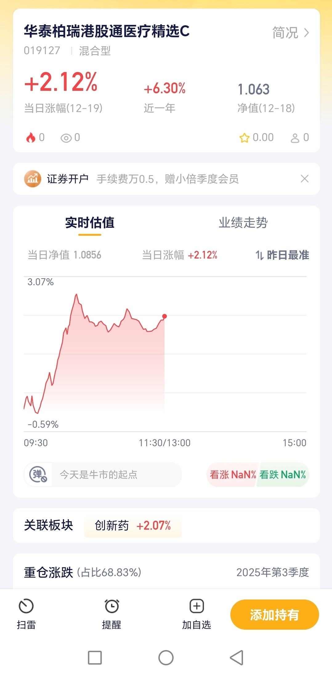 今天创新药板块涨了2.07%,医疗赛道算是迎来了一波小高潮,港股的医疗标的也跟着水涨船高。华泰柏瑞今天涨幅2.12%,完美跟上了板块的步伐,更别说近一年还有6.30%的收益,在医疗基金里妥妥的优等生。它主打港股通医疗精选,能精准布局港股的优质医疗股,现在创新药行情启动,医疗板块的估值也在慢慢修复,这时候关注这只基,说不定能吃到后续的行情红利,手里有闲钱的可以慢慢建仓试试。$华泰柏瑞港股通医疗精选混合发起式C$ #【跨年坦白局】提问金梓才、陈果#