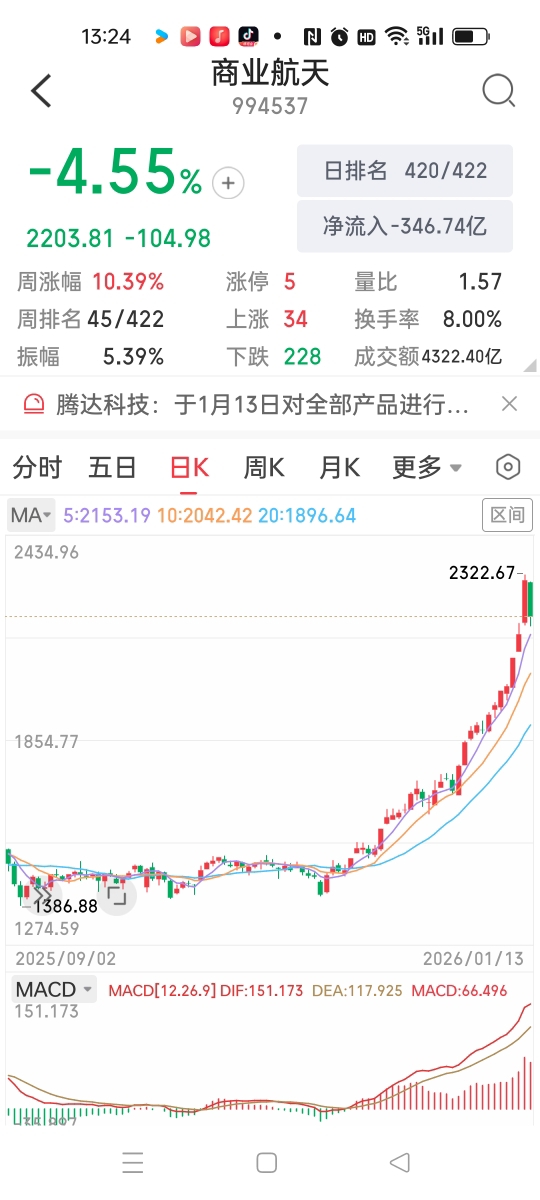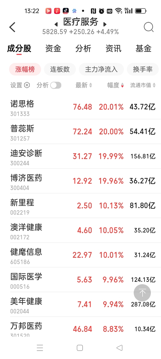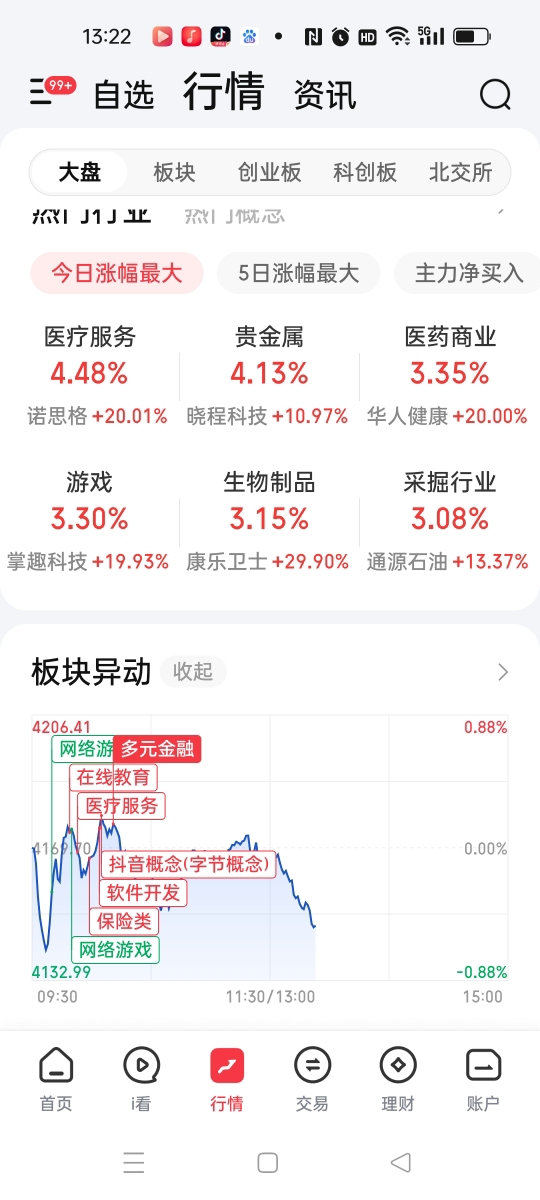 我前几天也说过,医药医疗板块是这波上涨来压阵的,果然今天军工和商业航天板块回落了,医药医疗板块就给力上涨了,所以指数没有啥跌,因为医药医疗板块的个股很多,有一定的权重,所以对冲了军工、商业航天板块的回落。