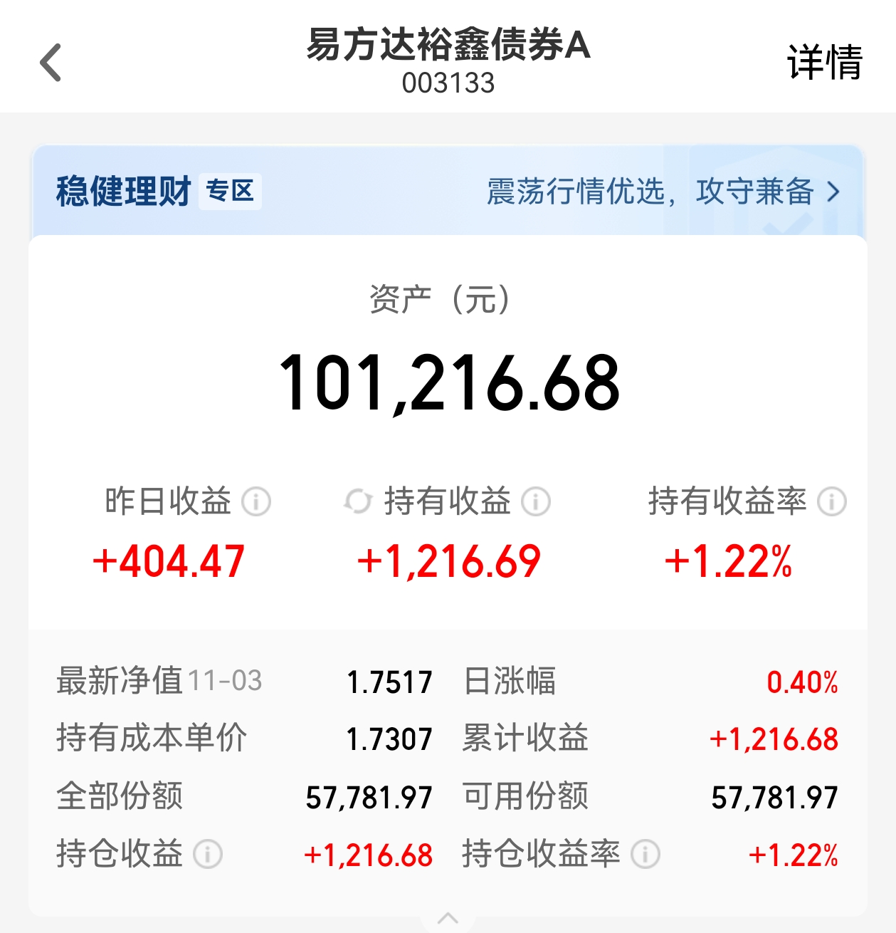但最近俺的乖乖固收+$易方达裕鑫债券A$ 表现倒是很赞,昨晚爆蛋40个,马上就要突破前高啦!近一周收蛋96个,近三月收蛋788个,近六月收蛋1518个,综合表现已经跑赢了不少权益选手了,但波动相对权益来说还是要小的多,毕竟它的股票占比不到20%,高弹性更多依靠的是40%的可转债持仓,但是可转债自身又具备进可攻退可守的属性,所以相对个股来说风险更小,主打一个用小部分风险承受度来撬动不小的收益,稳的不行行的~目前小小已经收了122个蛋,继续躺平等收获,近一年业绩裕鑫比沪深300涨得多回撤还小,反正作为稳健部分的增收,这节奏小小很满意~
