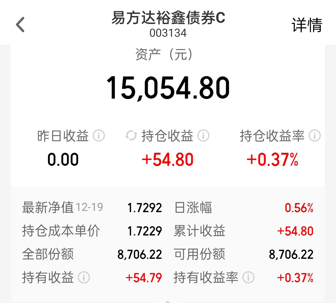 超预期了,十二月初开始定投买入的易方达裕鑫债券(C类:003134)已经开始赚钱了,累计投入三期,每次买入5000元,当下已经盈利54.8元,持仓收益率为0.37%。临近年底,市场货币资金也是偏紧的,十二月市场整体都是震荡,热门板块收益回撤也较大,在这个时候还能企稳赚钱,确实不容易,也体现了该基金的固收+属性,岁末年初买点债基确实不错,关键是这个债基进可攻,退可守。