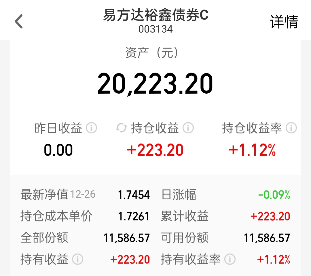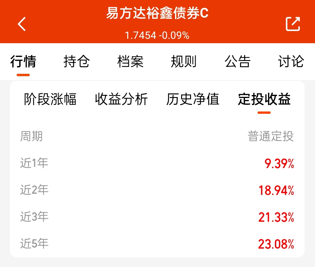 有朋友给我们留言,说这个易方达裕鑫债券(C类:003134)涨的太快了,从定投开始到现在已经有1.12%的收益了,要是按照这个外推,岂不是一年有超过12%的收益率?这个怎么说呢,收益外推确实是不对的,但看历史收益是可以的。我看了下过去定投一年收益有9.39%,两年的话有18.94%。这两年确实做到了攻守兼备,至于未来怎么样,可以耐心持有,静观其效。今天继续买入定投5000元。